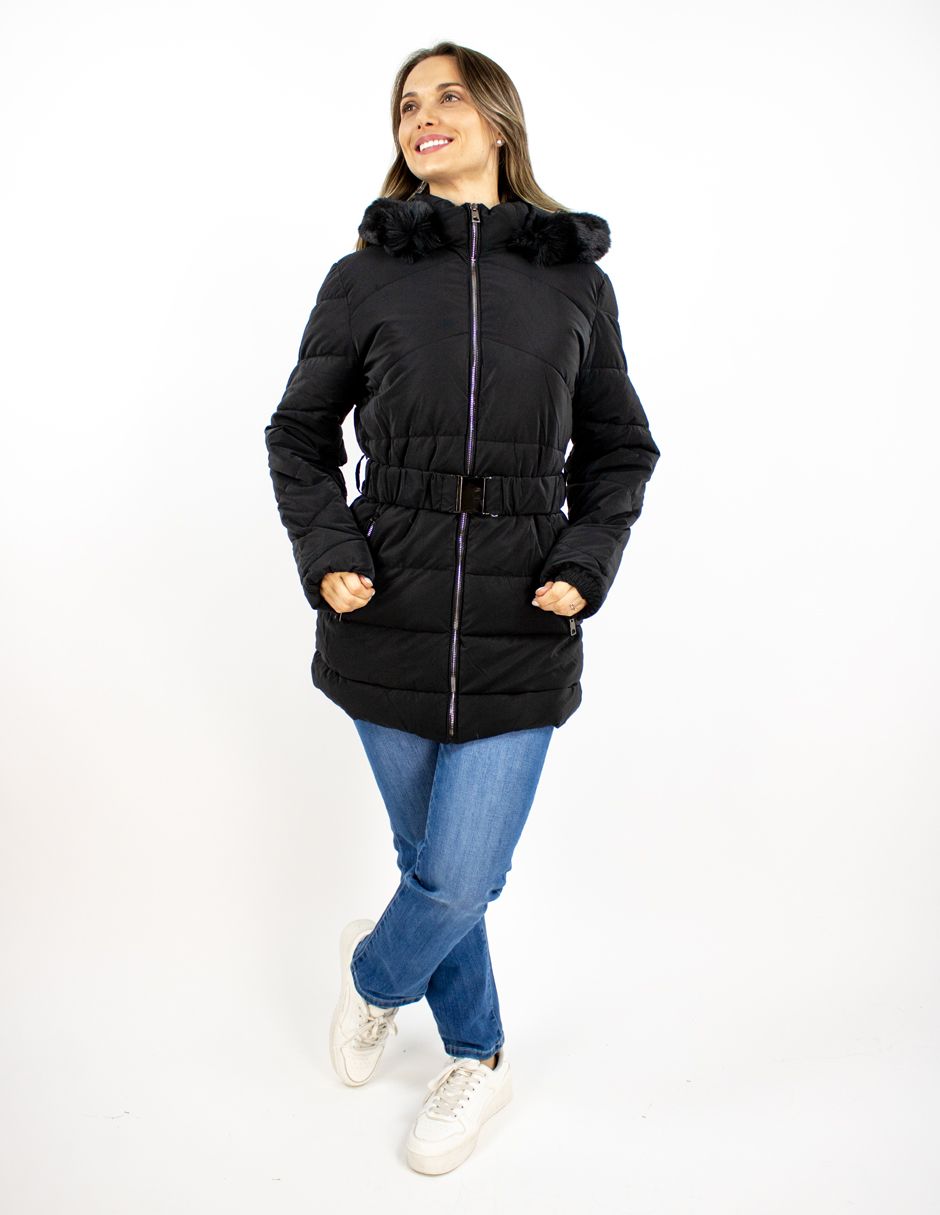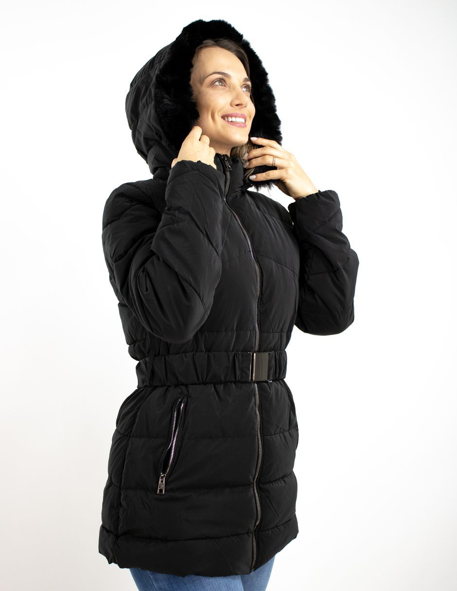 Chamarra Puffer Larga Con Zipper Con Peluche En Capucha Y Cinto