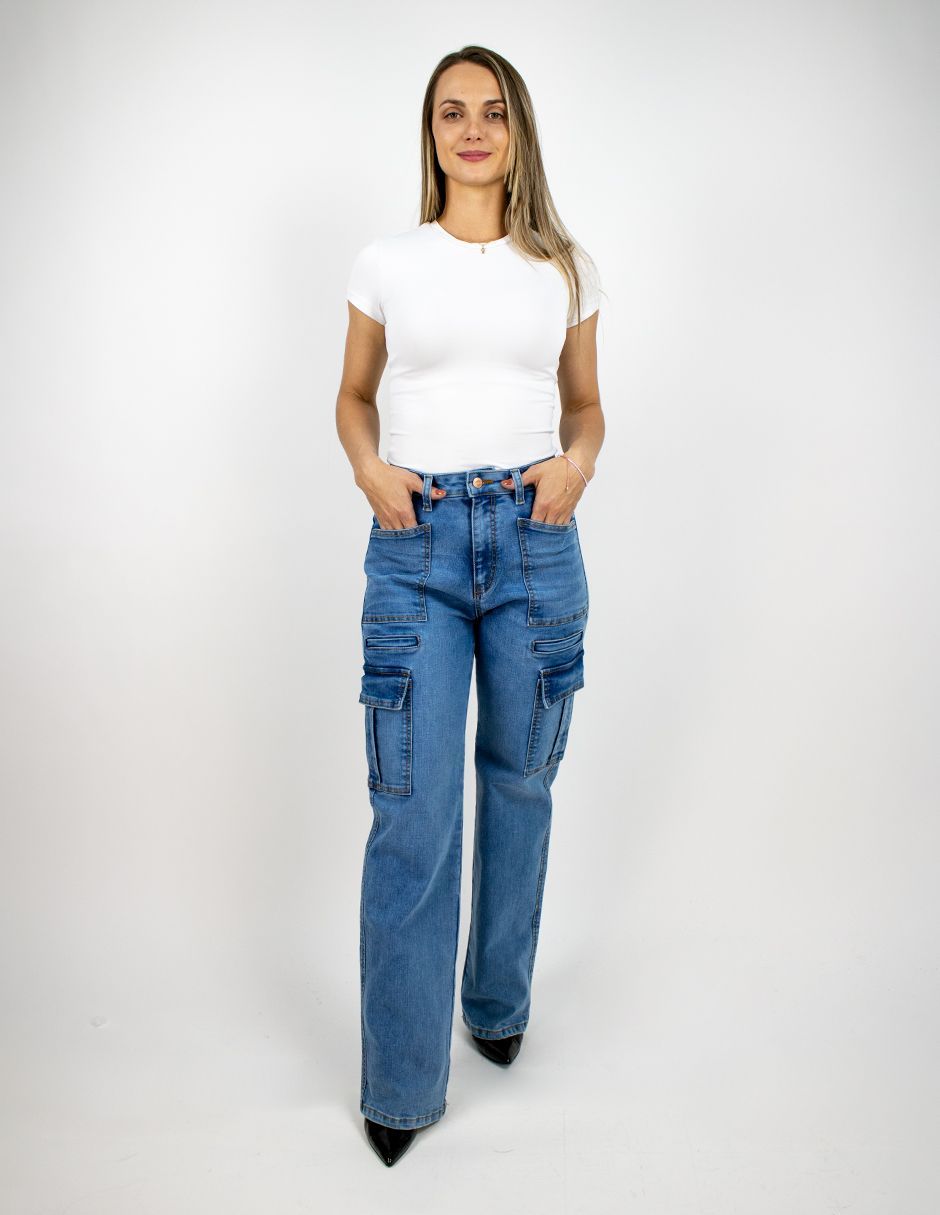 Jeans Furor Mezclilla Wide Leg Fit De Cintura Alta Con Bolsas Sobrepuestas y Cargo, Pierna Amplia Hasta El Tobillo