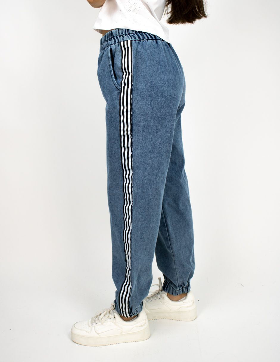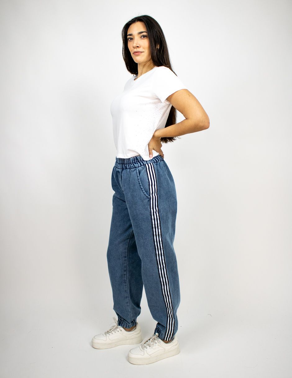 Jogger Furor Mezclilla Relaxed Fit De Cintura Alta Con Elástico, Pierna Relajada, Cinta Con Franjas Al Costado y Tobillo Con Elástico